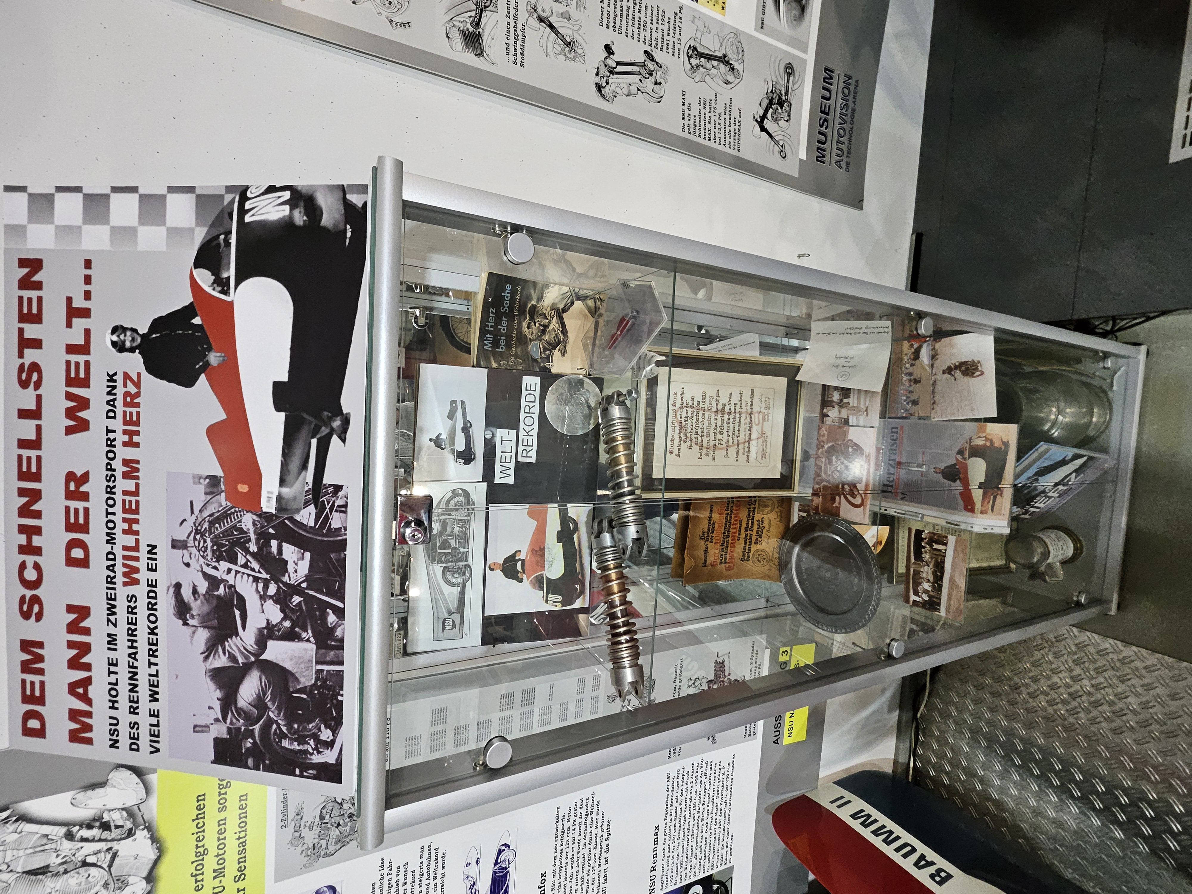 Eine der besten Methoden für ein gutes Marketing ist natürlich der Erfolg, besonders im Motorsport aber auch bei Weltrekorden. NSU war in beiden Rubriken gut vertreten - auch Dank des legendären Rennfahrers Wilhelm Herz. Eine Vitrine mit originalen Urkunden und weiteren "Devotionalien" zu seiner Person hat bei uns einen Ehrenplatz!