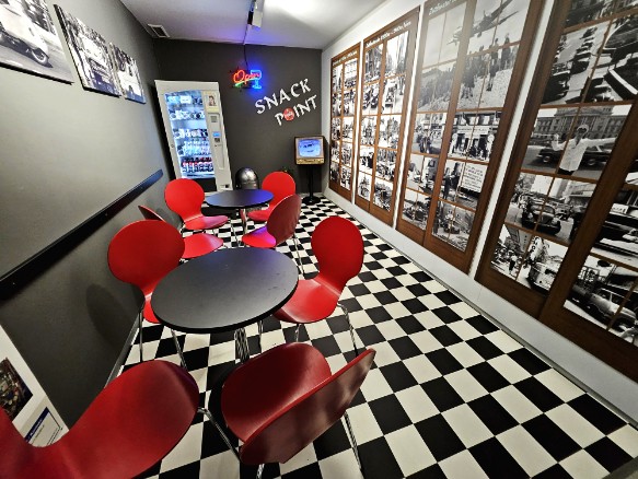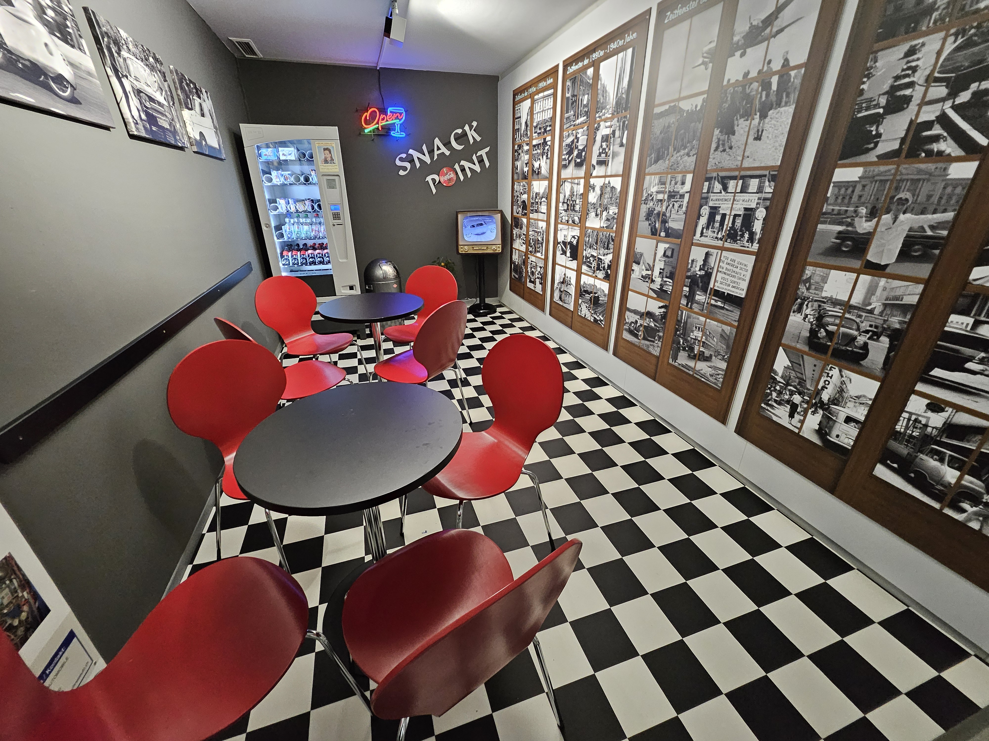 Direkt neben dem Selbstwahlkino im Untergeschoß befindet sich unser SNACK POINT im 50er Jahre-Stil. Genießen Sie historisches TV-Programm der 1950er Jahre oder schauen Sie durch unsere "Zeitfenster" mit Bilddokumenten aus der ersten Hälfte des 20. Jahrhunderts. Für den kleinen Hunger oder Durst zwischendurch steht unser Snack-Automat bereit.