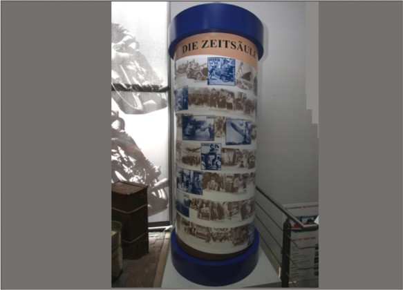 Doch wie kann man dem Besucher 200 Jahre Weltgeschehen auf einen Blick vermitteln? Diese Frage machte sich das Team der AUTOVISION zur Aufgabe und kam nach langer Überlegung zu einer gleichsam „genial einfachen“ und „einfach genialen“ Lösung: Man besann sich einerseits auf ein Medium, das sich schon seit über 150 Jahren als kommunikativer Informationsträger bewährt hat und nie ganz aus der Mode kam: Die Litfaßsäule. Andererseits sollte der Begriff „Zeitspirale“ visualisiert werden. Dem Betrachter soll durch Bewegung vor Augen gehalten werden, dass die Zeit und die damit verbundene Entwicklung der Mobilität immer weiter geht. Eine Litfasssäule ist hingegen ein starres Gebilde – normalerweise! Im Museum AUTOVISION gibt es von nun an die wohl erste Litfasssäule, die es dem Betrachter ermöglicht, den gesamten „Umfang“ der Säule zu betrachten, ohne sich von der Stelle bewegen zu müssen. Diese Litfasssäule ist mit einem Motor ausgestattet, der es nun zulässt, dass 200 Jahre Weltgeschehen langsam an einem „vorbeiziehen“.