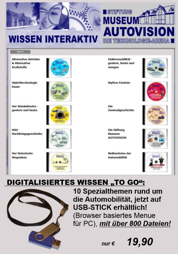 Die Stiftung Museum AUTOVISION ist schon seit ihres Bestehens bestrebt, den Besucher:Innen möglichst viel Hintergrundwissen zu den Exponaten in den sechs Ausstellungsbereichen mitzugeben. Anhand zahlreicher begleitender Ständerschilder, Displays und Infotheken bekommt man hier sehr viel mobiles Know How vermittelt. Neben der inzwischen auf vier Bände herangewachsenen Buchreihe von Museumsgründer Horst Schultz gab es seit des Bestehens der AUTOVISION die Möglichkeit, diese unglaubliche Menge an Informationen als Daten-CD´s für zuhause zu erwerben. Da die CD bzw. DVD als Datenträger jedoch immer mehr aus der Mode kommt und viele Nutzer digitaler Lesegeräte erst gar kein entsprechendes Laufwerk mehr besitzen, hat man sich nun entschieden, die komplette CD-Reihe auf USB-Stick anzubieten. Ab sofort kann man über 800 reich illustrierten PDF-Dateien aus zehn CD´s auf einem USB-Datenträger erwerben (Preis: € 19,90 + 2,00 Versand). Selbstverständlich führt ein übersichtliches Menue durch die einzelnen Themenbereiche von „A“ wie Alternative Antriebe bis „Z“ wie Zweiradgeschichte.